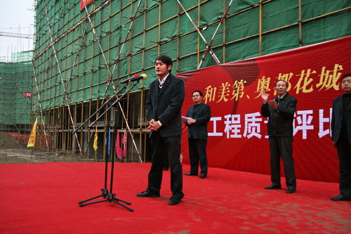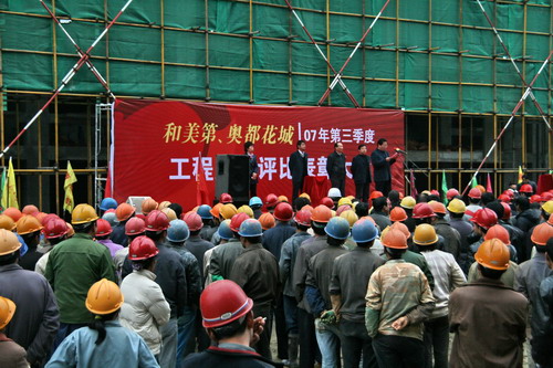 2007年11月17日下午,和美第工地上彩旗飄揚,鑼鼓喧天。和美第、奧都花城2007年第三季度工程質(zhì)量評比表彰大會在此隆重召開。集團公司執(zhí)行總監(jiān)孫九江、新能源虎豹公司總裁顧載兵等公司領(lǐng)導(dǎo)出席了表彰大會。會上對獲獎的施工單位給予了表彰和獎勵。