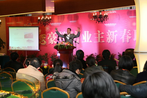 2月6日下午,以五星級(jí)標(biāo)準(zhǔn)打造的豪第坊會(huì)所里到處洋溢著歡聲笑語,100多名項(xiàng)目業(yè)主跟建設(shè)者們?cè)诖伺e行新春聯(lián)誼會(huì),新能源虎豹公司董事長包廣林和總裁顧載兵分別做了精彩的歡迎辭。