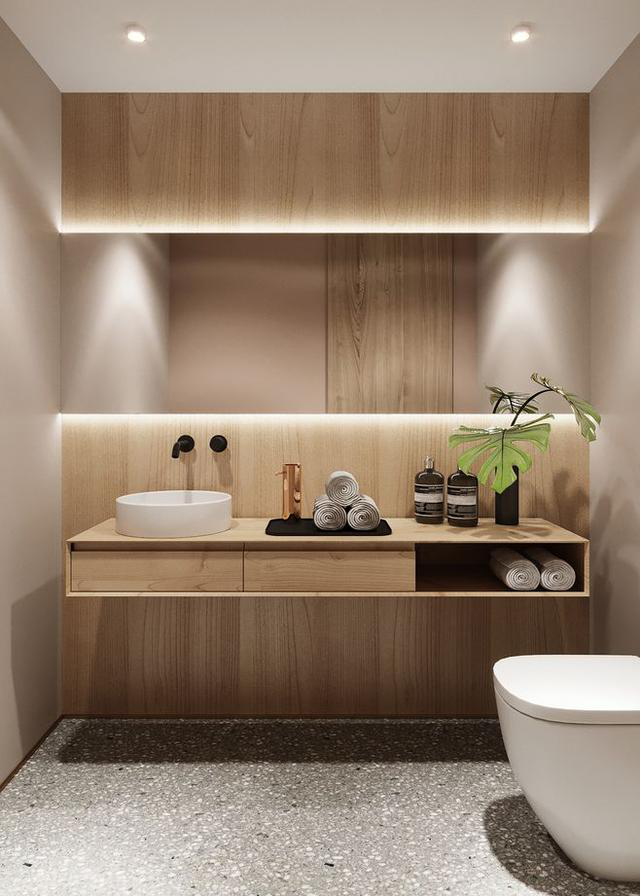注重實(shí)用性的話可以選擇在馬桶后方的墻面開挖一個壁龕,既不會額外占據(jù)空間,也能伸手就夠到物品,輕松解決了卷紙用光的尷尬。