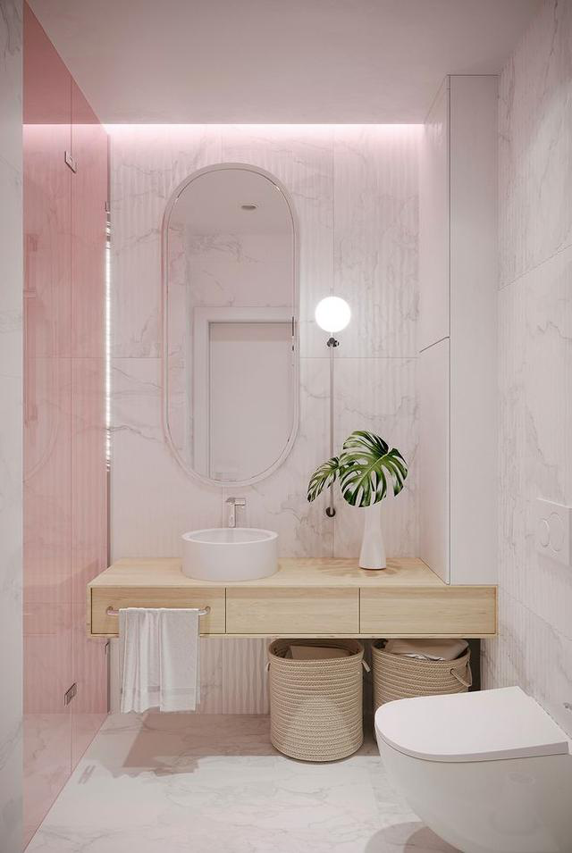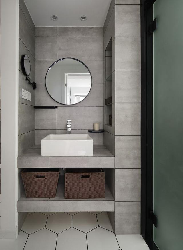 近幾年流行在衛(wèi)生間挖壁龕來實(shí)現(xiàn)收納的需求,而上面的案例設(shè)計(jì)就融合了壁龕元素,而底部也額外增加了一層收納空間,利用收納筐來擺放洗漱用品,整體內(nèi)嵌式的布局設(shè)計(jì)也使得空間顯得更整潔。